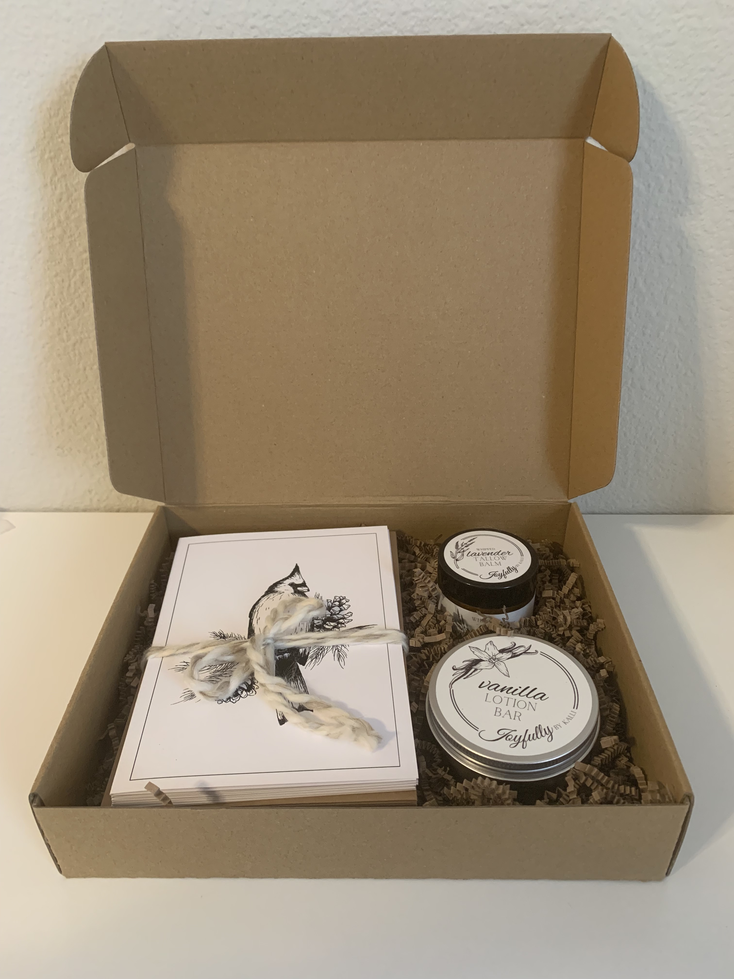 Currently, I have one type of gift box put together. My sister made each of the beautiful cards in this package and the matching tag.